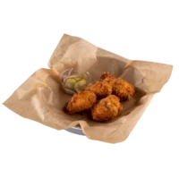 Kajun patates kızartması, çıtır tavuk parçaları, acılı mayonez, kıtır soğan ev yapımı turşular ve acı sos ile servis edilir.