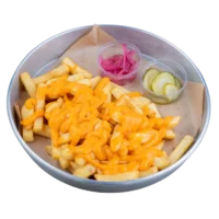 Kajun patates kızartması, peynir sos, kıtır soğan, ev yapımı turşular ve acı sos ile servis edilir.