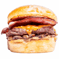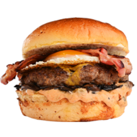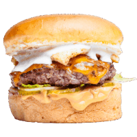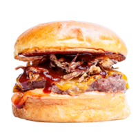 Brioche ekmek, Burger sos, peynir, dana bacon, kıtır soğan, bbq sos ve patates kızartması ile ev yapımı turşularla servis edilir.