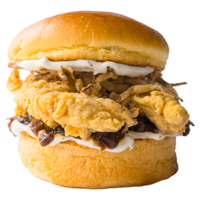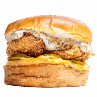 Brioche ekmek, Tavuk eti, procces cheese, ranch sos, turşu ve patates kızartması ile ev yapımı turşularla servis edilir.