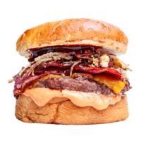 Brioche ekmek, Hamburg Köftesi, Karamelize Soğan, Mantar, Peynir, Domuz Bacon ve patates kızartması ile ev yapımı turşularla servis edilir.